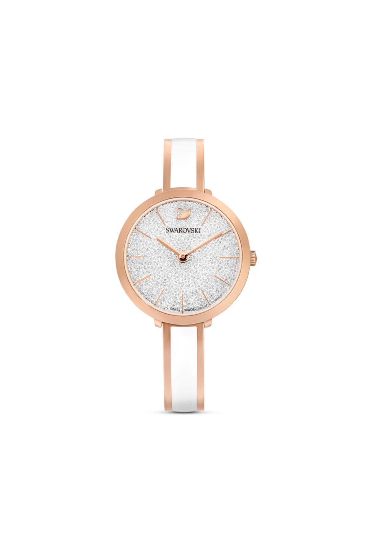 Zahmetsiz şık tarzdaki bu kullanımı kolay Swarovski saat, ikonik Crystalline ışıltısıyla göze çarpıyor. Modern kadranı ve zarif pembe altın renkli PVD kaplama paslanmaz çelik kasasında, ışıltı saçan yaklaşık 1000 berrak kristal yer alıyor. Takılardan ilham alan ve aynı şekilde pembe altın renkli PV kaplama paslanmaz çelikten üretilen bileklik, ışıltılı beyaz minenin kullanıldığı minimalist tasarımla tamamlanıyor. Bu sezon ve sonrasında kullanılabilecek harika bir aksesuar olan saat İsviçre’de üretilmiştir ve 50 m’ye kadar suya dayanıklıdır. Ayarlanabilir halkaları sayesinde her türlü bilek boyutuna uygun hale getirilebiliyor.