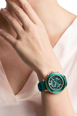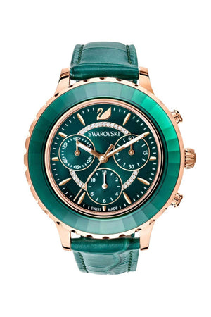 En çok satan Octea saat koleksiyonumuz, bu yeni ve lüks kronograf saat ile hassasiyet ve işçilikte yeni bir seviyeye erişiyor. Günlük tarzınız için mükemmel bir seçim olan tasarım, birikmiş ve aralık zamanlama özelliklerine sahip süre ölçme fonksiyonuyla tamamlandı. Kasada pembe altın rengi kaplama paslanmaz çelik kasa kullanılırken, yalnızca Swarovski saatlerine özel façetalı kristal bezel, güneş ışını mine ve timsah desenli hakiki deri kordon tasarımlarının üçü de zümrüt yeşili tonlarında ışıldıyor. Kasa: 39 mm, 50 metreye kadar suya dayanıklı, İsviçre yapımı.