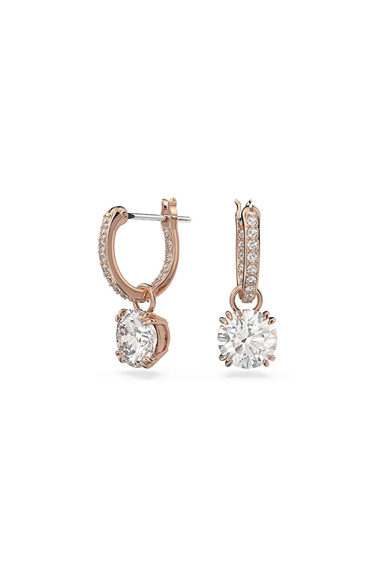 Constella ailesine ait bu baş döndürücü damla küpeleri sonsuza dek kullanmak isteyeceksiniz. Dramatik ve zarafet arasındaki dengeyi yakalayan parçanın odak noktası göz kamaştırıcı taşlar, pembe altın rengi kaplama üzerine yerleştirilen halkaların pavé detayları ile zenginleştirildi. Kelimenin tam anlamıyla göz kamaştırmaları için saçlarınızı arkaya atarak kullanın.