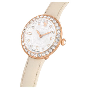 Bu Certa saat, sanat ve performansın görkemli bir füzyonunu sunuyor. Son derece güzel pembe altın rengi bir yüzeyle tasarlanan 30 mm yuvarlak kasa, 30 kristalin pavé tekniğiyle yerleştirildiği bir çerçeve ile tamamlandı. Mineral camın altında, saat 12 yönünde Swarovski kuğu logosuna ve yuvarlak ve baget kristallerle tasarlanan gösterge işaretlerine yer veren baş döndürücü guilloché bir kadran öne çıkıyor. Ayrıca saatin kurma koluna da tek bir kristal yerleştirildi. Saat, bileğinizin çevresini güzel bir tarzla saracak şekilde seçkin dikişlere sahip ve kolay takılıp çıkarılabilen bej renkli İtalyan dana derisi bir kayış üzerinde sunuluyor. 50 m’ye kadar suya dayanıklı olan bu İsviçre yapımı saat, sizi günlük etkinliklerinize üstün seçkinlikten ödün vermeden tam zamanında yetiştirecek şekilde tasarlandı.