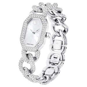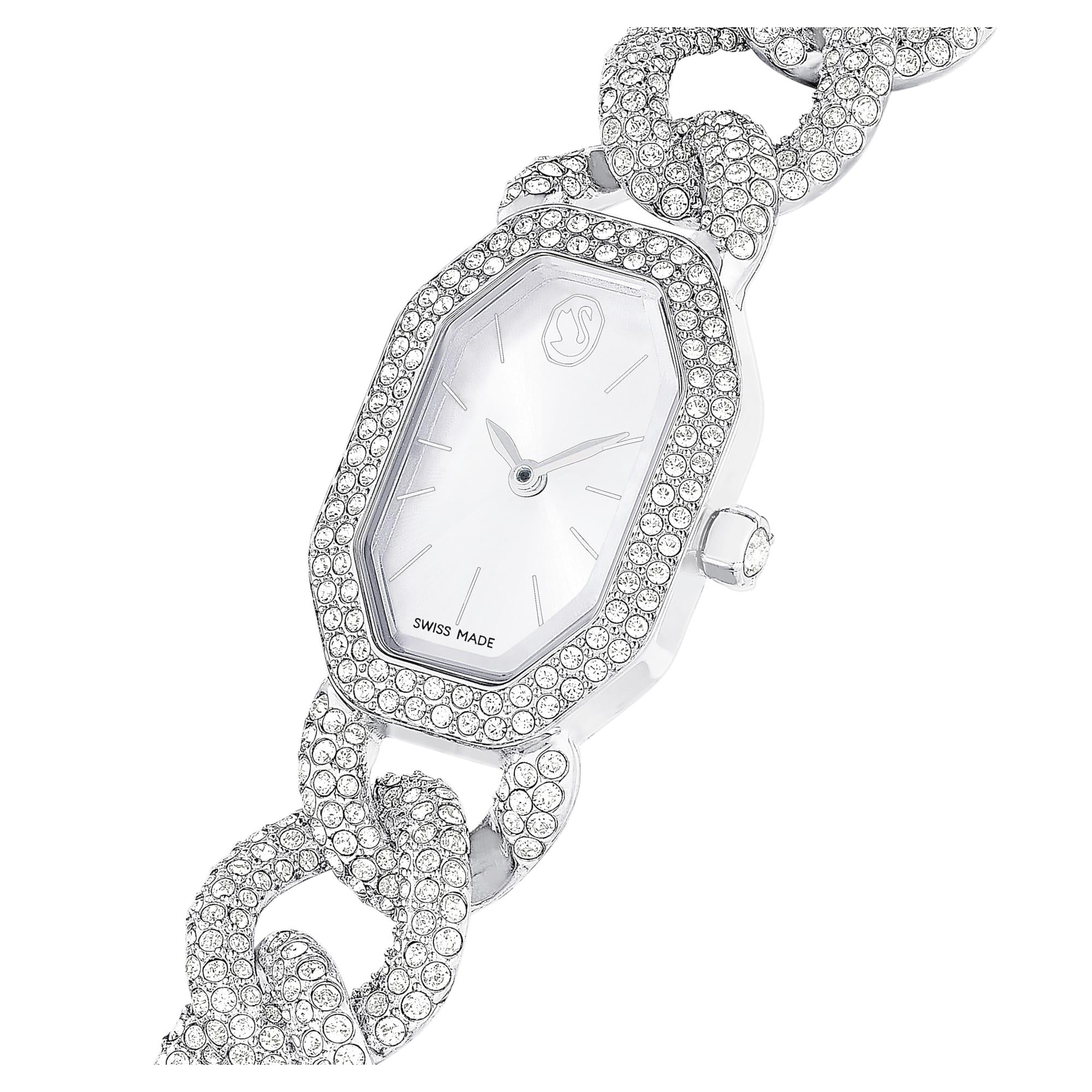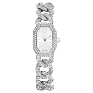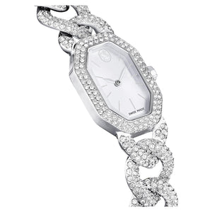 Swarovski’nin efsanevi sekizgen şeklini vurgulayan ve 623 adet kristalle yerleştirilen bu göz kamaştırıcı saat, tıpkı lüks bir takıymışçasına görkemli bir tarz sunar. Uzunluğu 44 mm olan paslanmaz çelik kasa, çerçevesinde ışıltılı bir pavé ve saat 12 yönünde zarif bir Swarovski logosu dokunuşuyla hayat bulan güneş ışını kadranla tamamlanıyor. Saat, 530 adet kristalle süslenen ayarlanabilir gurme bir zincirle bileğinizi sararken tekli kristal ise kurma koluna yerleştirilmiştir. Bu İsviçre yapımı saat 30 m’ye kadar suya dayanıklıdır ve size hem günlük ihtişamınız hem de görkemli özel günler için eşsiz bir seçenek sunar.