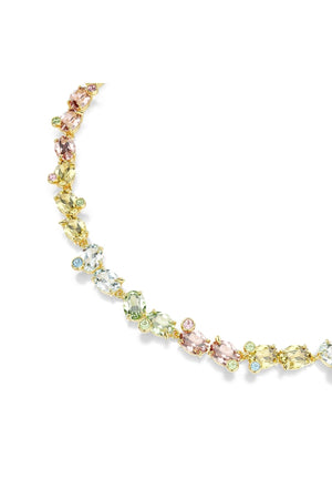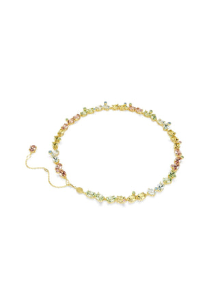 Bu tam tur Gema kolye, cesur renkleri ve parlak ışık yansımalarıyla neşenin güçlü bir ifadesine hayat veriyor. Altın rengi kaplama tasarım, her biri oyuncu baloncuk tırnaklı yerleştirmeyle yerleştirilen daha küçük kristallerin eşlik ettiği çok sayıda canlı tonda tam tur büyük kristallerle tamamlanıyor. Enerjik olduğu kadar coşkulu bir etkiye sahip bu parça, güneşli günleri anımsatan ve ruh halinizi yükselten bir takı sunuyor.