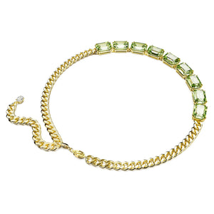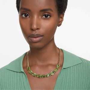 Bu çarpıcı Millenia kolye ile neşeli ihtişam hissiyatını öne çıkarın. Her biri Swarovski’nin çift tırnak yerleştirme tekniği uzmanlığını gözler önüne seren sekiz, yeşil kristallerle oluşturulmuş kristal dizileri ön kısmı süslüyor. Istakoz kapama mekanizmasına yer veren tasarım, çağdaş bir dokunuş katması için kalın, altın rengi kaplama zincirin ucunda duran bir adet Swarovski Zirkonya ile tamamlandı. Kokteyl elbiselerinden beyaz tişörtlere kadar tüm görünümlerinize uyum sağlayacak bir kolye.