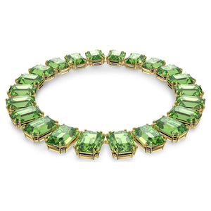 Bu canlı tam tur kolye bir sıra yeşil renkli üçgen kesim kristallerle oluşturuldu ve öne çıkan altın rengi kaplama yerleştirme ile tamamlandı. Günlük görünümünüze bir tutam prizmatik renk katan bu eğlenceli parçayı tek renkli ürünlerle kombinleyerek bütün ışıltıyı üzerinize çekin. Kreatif Direktör Giovanna Engelbert tarafından Collection I için tasarlanmış olan bu kolye, Millenia ailesinin bir üyesi. Nasıl kapanır ve açılır: yuvarlak batonu karşılık gelen en geniş zıt halkaya yerleştirin ve en alta kadar aşağı kaydırın. Yerleştirdikten sonra kapamayı sabitlemek için üstteki D halka güvenlik mandalını indirin. Açmak için D yüzük güvenlik mandalını kaldırın ve batonu çıkarmak için en geniş noktaya kadar kaydırın.