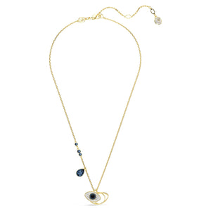 Bu mistik Symbolica kolye hem koruma hem de göz alıcı bir tarz sunmak için tasarlandı. Tasarım; mavi, siyah ve berrak kristal pavé kubbeli bir nazarlık motifinin yanı sıra altın rengi kaplama versiyonuna da sahiptir. Boynunuzu saracak bu boncuklu zincir, yuvarlak ve armut kesim koyu mavi kristallerle süslendi. Her güne öz güvenle başlamak için bu parçayı kullanın.