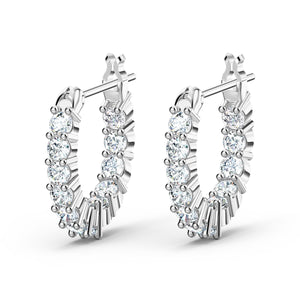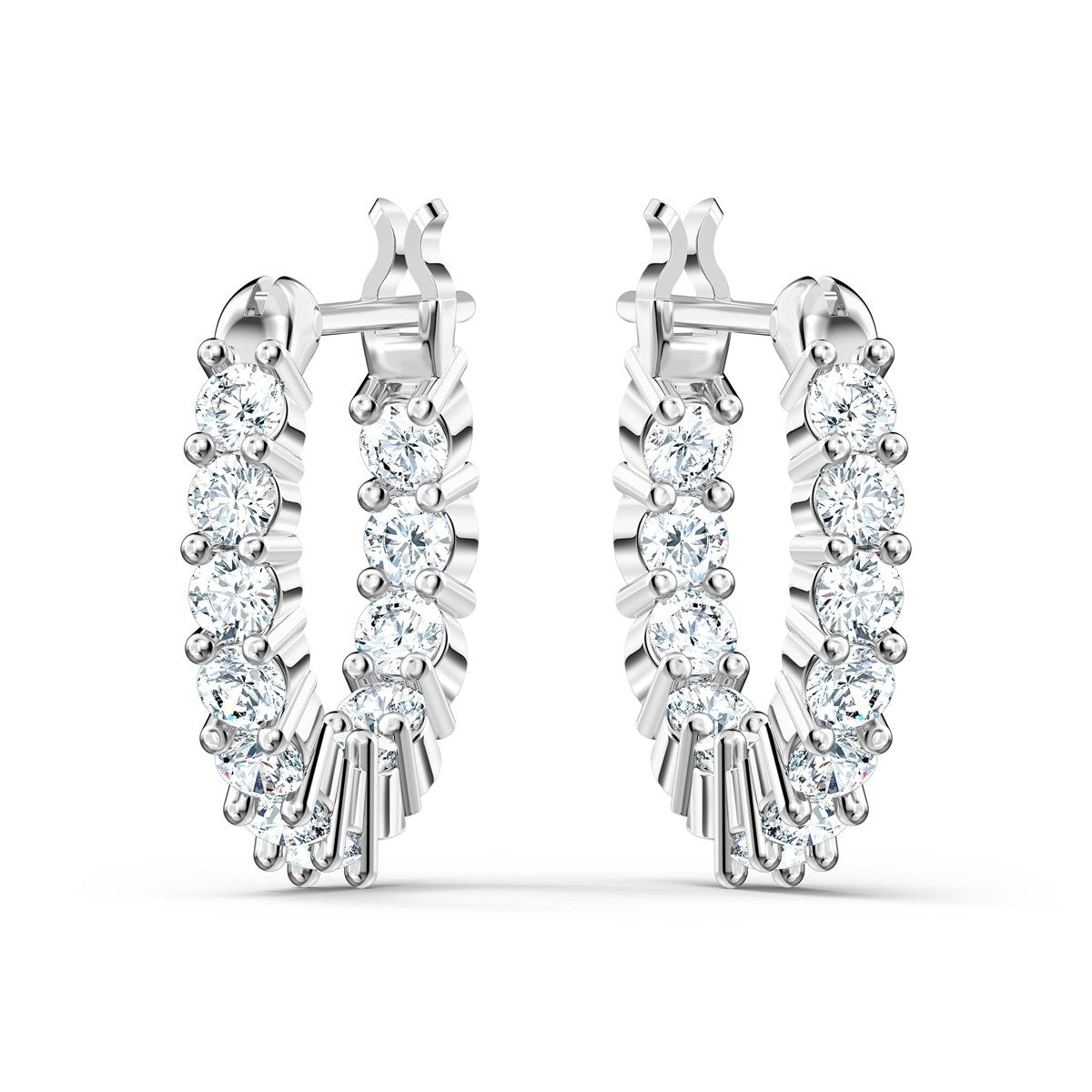 Swarovski tasarımı bu iğneli küpe çifti kendine hayran bırakan ve zamansız bir takıdır. Her iki halka küpe de ilgi çekici görünümlerini zarif bir ışıltıyla güçlendiren çeşitli ışıltılı beyaz taşla yerleştirildi. Uyumlu kolye ve bilekliklerle en iyi tarzı sunan bu küpeler günlük aktiviteler söz konusu olduğunda beğeni toplayacak bir hediyedir.